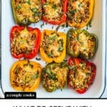 - Bake the peppers: Top with a handful of shredded mozzarella, and grated Parmesan and/or panko or breadcrumbs. Place the peppers back onto the parchment lined baking sheet and bake 20 minutes until the cheese melts. Allow to cool a few minutes before serving.