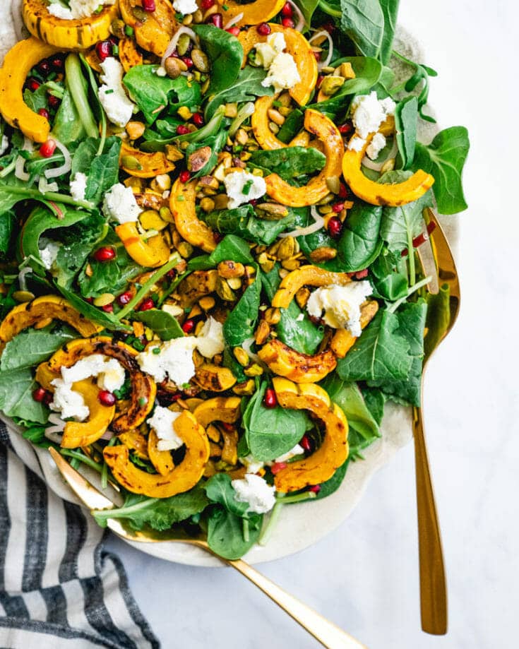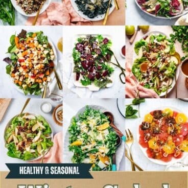 One of the best ways to keep eating vibrant, colorful vegetables even in the cold months? Winter salad! You’ll be surprised by the amount of bright colors and varied textures you can pack into a salad. Seasonal ingredients star in these winter salad recipes, featuring leafy greens like kale and spinach, pomegranate seeds, citrus, apples, pears, Brussels sprouts, beets, and winter squash. They combine into some of the most delicious salads you’ll have, the perfect accessory to a cozy winter dinner.