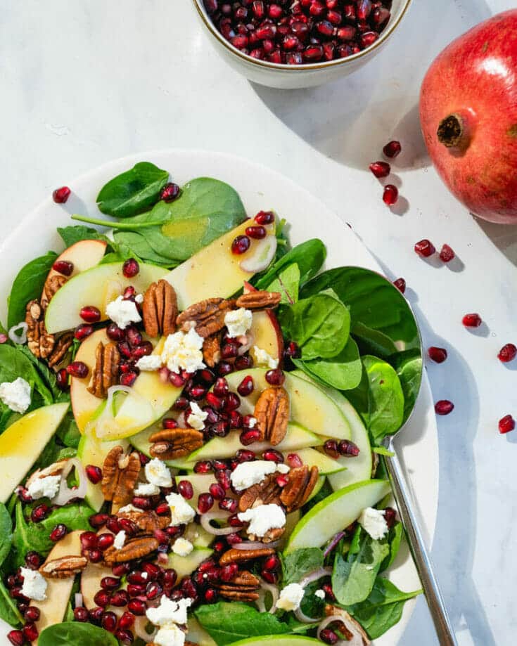 The best winter salad recipe? This one. Crunchy pomegranate seeds make a beautiful confetti over the top of leafy greens. Add tart green apple slices, toasted pecans, and goat cheese or feta crumbles, and it’s a true symphony of flavor! Pick from a few different dressing choices: our favorites are apple cider vinegar dressing or pomegranate vinaigrette.