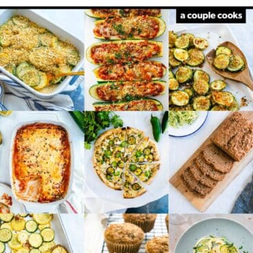 These zucchini recipes pair well with summer favorites. I love serving the main dishes with corn salad, caprese salad, or grilled corn. The baked goods are perfect for brunch spreads, afternoon coffee, or as dessert with fresh berries and whipped cream.