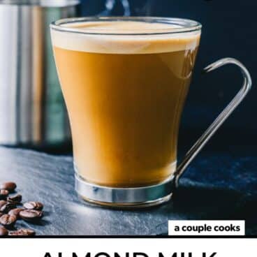 The most difficult part of making a hot almond milk coffee? How to froth almond milk. Different brands of almond milk froth differently, so you’ll need to experiment to find what works best. The best type of milk to froth almond milk? Buy Barista almond milk, which froths in a more similar way to dairy milk. But you can also use the regular variety! This is what we used here; you can see from the photos that it gets lightly frothy.