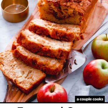 Here’s a cozy, fun quick bread to make any time of the year: try this Apple Bread recipe! It’s got a moist, tender crumb, and is bursting with tangy fruit, warm spices, and a brown sugar cinnamon swirl. It’s a total crowd pleaser! Everyone loves this spiced bread, and it makes the kitchen smell incredible. We couldn’t stop sneaking bites!