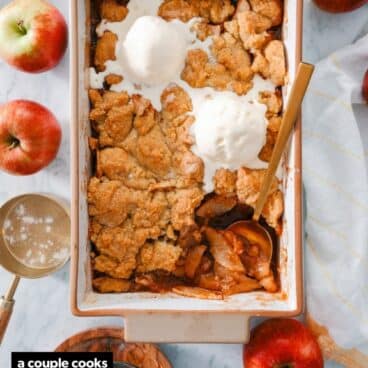 Here’s a cozy baked good that’s calling your name: this easy apple cobbler recipe! The topping is a meld of a biscuit and a sugar cookie, chewy, sweet and baked into golden-brown dollops. It covers a sweetly-spiced apple layer that’s flavored with cinnamon, ginger, nutmeg and lemon zest for a little pop. Top it with melty vanilla ice cream and there’s really nothing more we want in an apple dessert.
