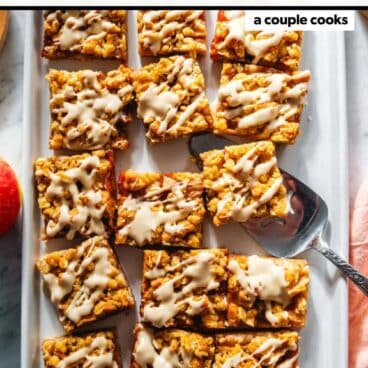 Looking for an easy dessert that will have everyone talking? Try this apple pie bars recipe! It’s simple to whip up this handheld treat: the same dough makes a sturdy bottom crust and buttery crumbles of streusel topping. Sandwiched in between the layers is a cinnamon-spiced apple filling, and it’s topped with a sweet maple icing drizzle that tastes a bit like melty vanilla ice cream. These are absolutely fabulous and one of our favorite fall desserts yet.