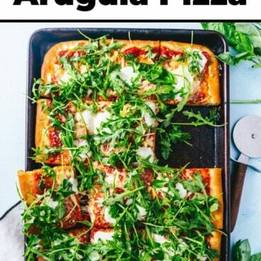 You can use this arugula pizza recipe as a guide for topping your pizzas with fresh greens! This topping idea works for any pizza recipe, or you can use our amazing and tasty sheet pan pizza: more on that below. Here’s all about need to know about adding arugula as a pizza topping: