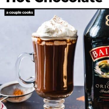 Love Baileys? Then here’s a warming cocktail to put on your to-drink list: Baileys Hot Chocolate! It’s got the best deep chocolaty flavor, accentuated by the chocolate and vanilla notes with the fruity finish of Irish whiskey. Topped with fluffy whipped cream, it’s a revelation! Serve this sweet hot alcoholic drink anytime you need a wintery pick me up: or it’s great for the holidays or a snow day. Here’s how to make it!