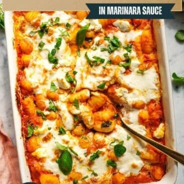 Everyone loves this easy baked gnocchi recipe! It features the doughy pasta baked in tangy marinara, layered with two types of gooey cheese. You don’t even have to boil the gnocchi: just throw it in the pan and bake.