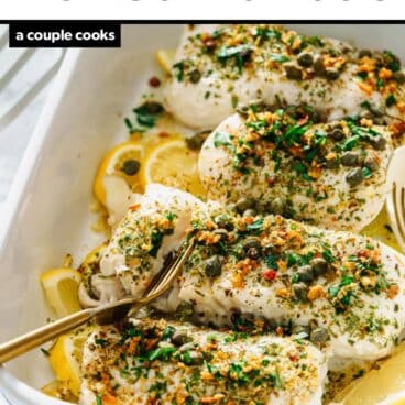 Oh hey there, welcome to one of our favorite fish recipes ever. Meet our best halibut recipe! This genius way to cook this popular white fish bakes it until flaky and tender with garlic and lemon, along with capers if you love that salty, briny pop. Once it’s juicy and baked, shower it with the secret sauce: finely minced parsley and crispy fried onions, which add a pop of salt, herbaceous flavor and a crunch. You’ll want to use this trick on everything!