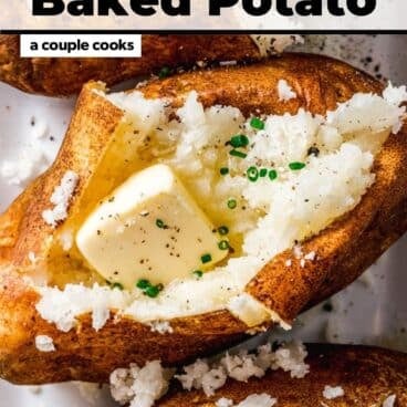 Here’s our master method for how to make a baked potato in the oven! The tricks? Bake at a high temperature, and don’t use aluminum foil. This makes the best crispy exterior and fluffy interior! Foil makes them come out too soft. Here’s how to bake a potato: