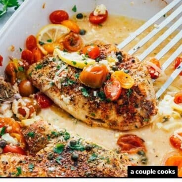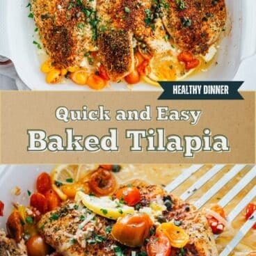 There’s something magical that happens when you combine tilapia with bright Mediterranean flavors: suddenly this fish transforms into a meal everyone wants seconds of! I’ve been making spins on this baked tilapia recipe for years. Everyone loves it so much that Alex and I published a variation of the recipe in our latest cookbook.