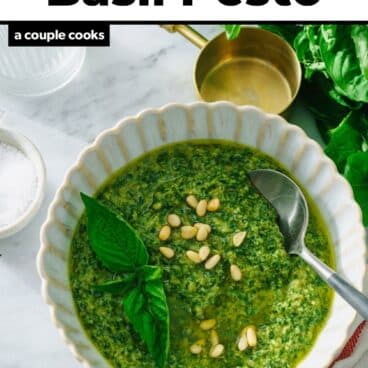 Got a load of fresh basil? Then run, don’t walk, to make a batch of this basil pesto recipe! It’s savory, garlicky, creamy, peppery, and you can slather a smear on anything. Is there anything better? Use it to take pasta from plain to magnificent, or throw it on a pesto pizza for maximum flavor. If you’re never made basil pesto at home: now is the time!