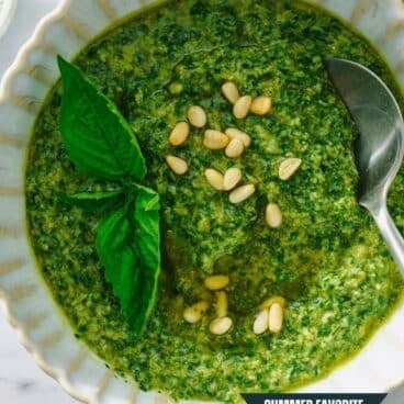 This basil pesto recipe is a flavor-packed classic Italian sauce starring basil, pine nuts, olive oil, and Parmesan cheese!