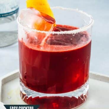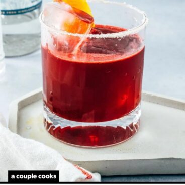 As you well know: a margarita is not a margarita without a salt rim (or is it?). This beet margarita is best served with a salt rim to accentuate the pop of flavors in the drink. Better yet: add a few blocks of clear ice! Here are a few notes on presentation: