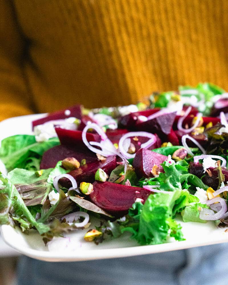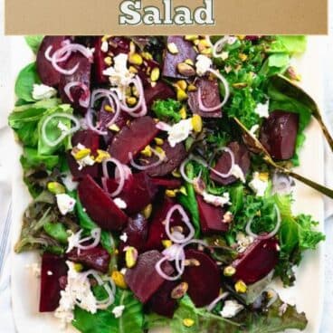 This beet salad recipe with goat cheese is perfection! Serve the roasted root veggie over greens with a tangy balsamic dressing.
