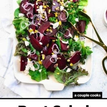 This beet salad recipe is a terrific fall salad or winter salad, or a side to pair with pizza or Italian recipes. Here’s a real dinner party menu where we ate this beet salad: