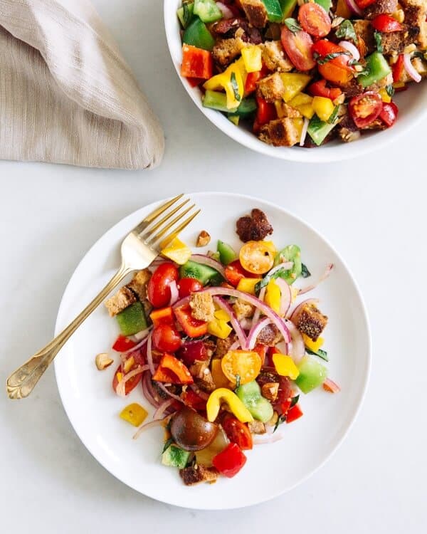 Another fantastic bell pepper recipe: panzanella! Panzanella is a traditional Italian bread salad: a way to use up leftover stale bread bits. The hard and crusty bread is marinated in a tangy dressing and mixed with ripe cherry tomatoes, red onion and multi-colored bell peppers. With a bit of fresh peppery basil, it's perfect for summer.
