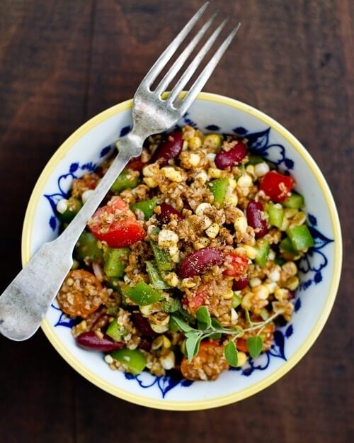 Here's a unique alternative to the classic bean salad recipe! This zesty Cajun salad is a grain salad with an unexpected spin: bulgur wheat, corn, and kidney beans are flavored with fresh oregano and Cajun seasoning.