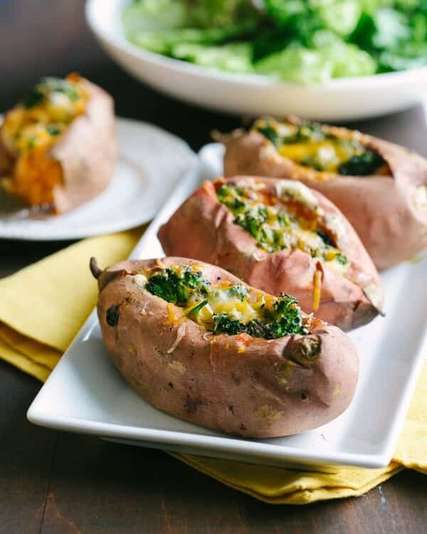 This bean recipe is hiding white beans, which are pureed into the cheese sauce to make it creamy! Stuffing sweet potatoes with broccoli and the cheese sauce make for an easy weeknight dinner.