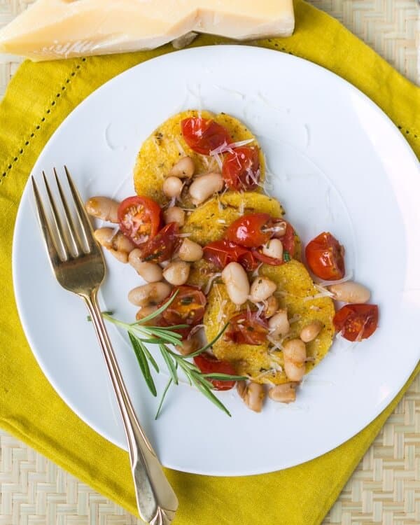 This pan-grilled polenta is perfectly crispy! Serve it with rosemary-infused white beans and tomatoes for a delicious Italian main dish.