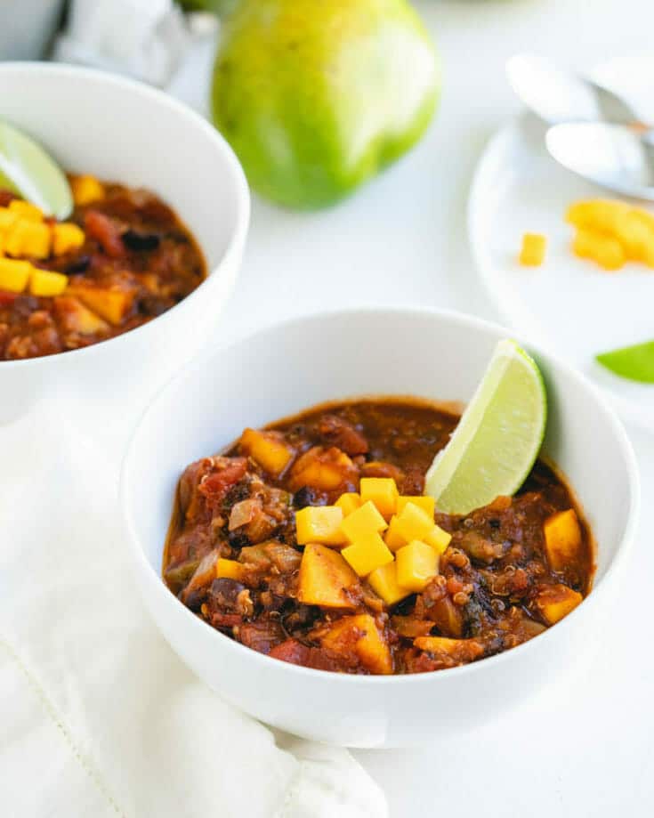 This black bean chili recipe features fresh mangos for a hint of sweetness! With a squeeze of lime and a hint of allspice, it's a unique spin on the standard. (Also try: Quinoa Vegan Chili.)