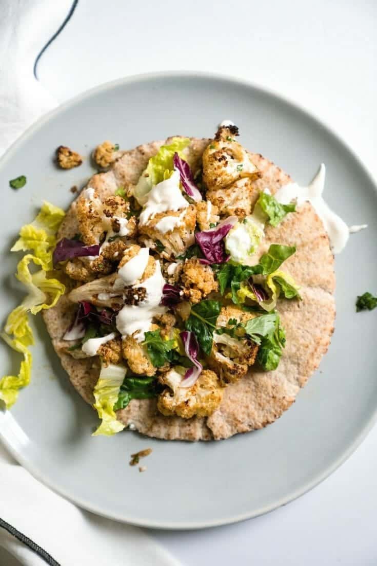 Oh, this cauliflower shawarma recipe. Roasted, spiced cauliflower is nestled in a warm pita and then smothered in a cool, creamy tahini-yogurt sauce. It's perfect for a lunch or light weeknight meal. Try it with a green salad like this one — if you can stop sneaking bites of that roasted cauliflower!