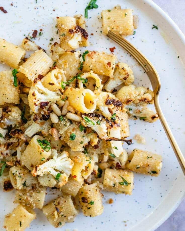 Here's a fantastic pasta dinner idea: Roasted Cauliflower Pasta! It’s got tender, caramelized roasted cauliflower: sweet, lemony and garlicky. Then it’s got al dente pasta that’s covered in a quick Parmesan pan sauce. Top it all off with crunchy basil breadcrumbs and toasted pine nuts and it’s an explosion of flavor.