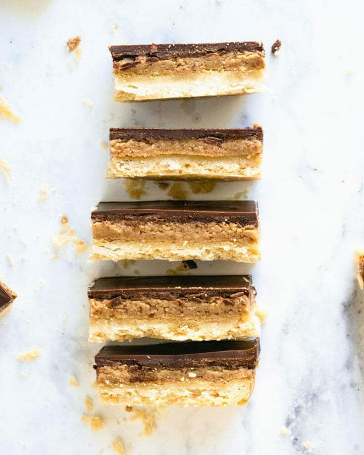 These pecan butter millionaire bars have 3 layers: shortbread, caramelized maple pecans, and chocolate! This vegan dessert recipe couldn’t be tastier. The shortbread layer is simply flour, coconut oil, and maple syrup. Instead of a caramel layer, nutrient rich pecans are caramelized with a bit of maple syrup, then blended into a pecan butter. It’s a crowd pleasing dessert that's one of our best healthy Christmas cookies.