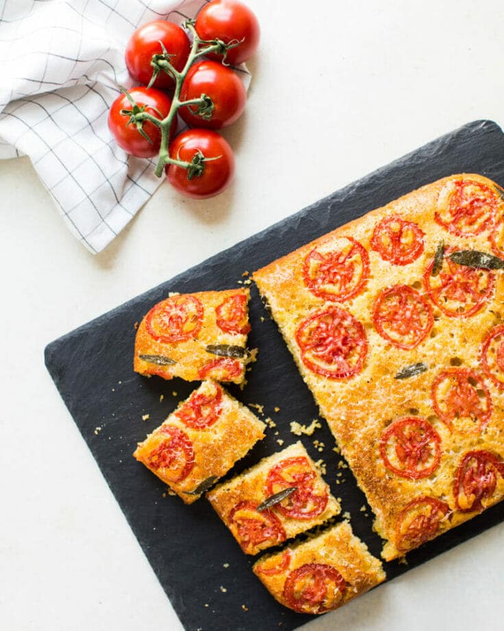 Here's a fresh tomato recipe that's actually...baked! This upside down cornbread is inverted after baking to show a lovely tomato design. For our concept, we’ve added fresh sage leaves as another detail and flavor component. And at the end, we decided to top the cornbread with grated Parmesan cheese and broil it until crispy. The colors are stunning and it's perfectly moist.