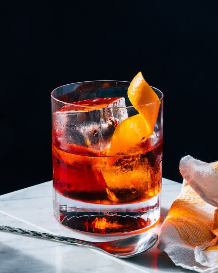 Here's a classic gin drink that's one of the most popular cocktails out there: the Negroni! The bright red of the Campari makes for a stunning jewel-tone statement of a drink. This three ingredient cocktail is easy to make and memorize: it uses one ounce each of gin, Campari, and sweet vermouth.