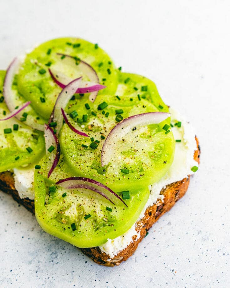 When I need a quick appetizer or snack, I slice green tomatoes thin and layer them on toast spread with goat cheese. The combination of tart tomatoes and creamy cheese is absolutely divine. I like to finish it with a drizzle of honey and fresh herbs from my garden.