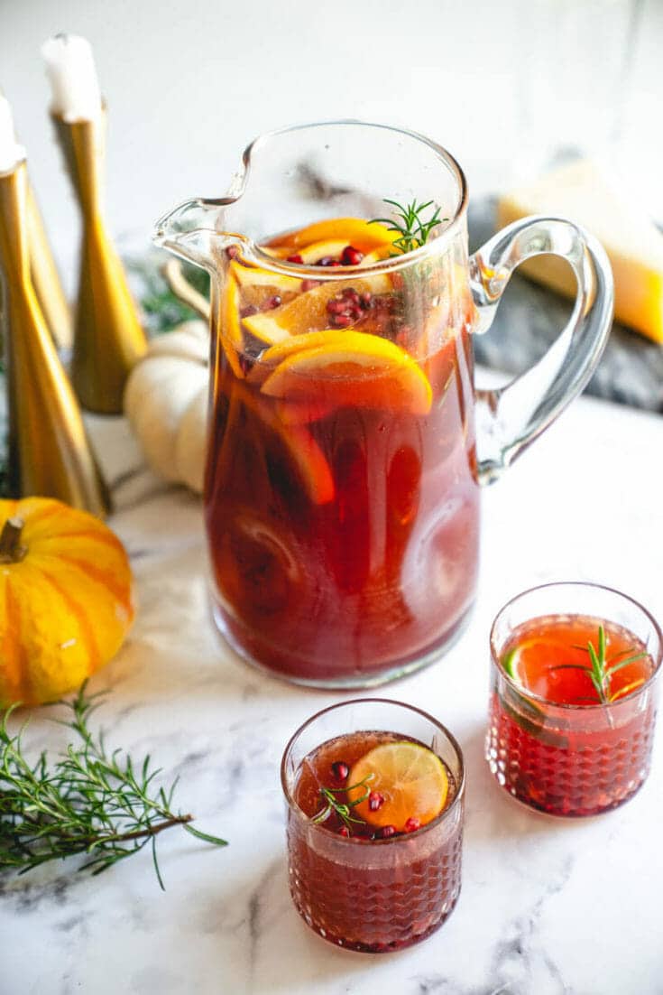 This non alcoholic Christmas drink could not be more beautiful! This holiday drink is basically a mocktail, made with iced tea, pomegranate juice, fresh orange and lime juice, and sparkling cider. Oh and it's garnished with rosemary. It's the beverage to enjoy with Christmas dinner. Because it's a mocktail, it works for everyone around the table!