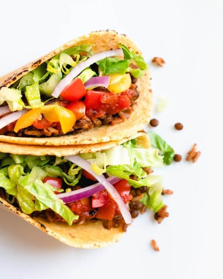 Lentils make a superb stand-in for taco meat, making a delicious vegetarian dinner recipe that even carnivores enjoy! The lentils are meaty and savory, and topped crunchy fresh veggies and salsa.