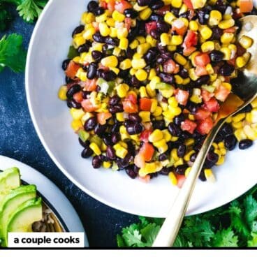 This black bean and corn salad is endlessly versatile! You can serve it for so many different occasions. This might just seem like a simple recipe: but we think it decreases the barriers between you and fresh, plant-forward eating. You can make it into a lunch, dip, or healthy dinner idea by serving it: