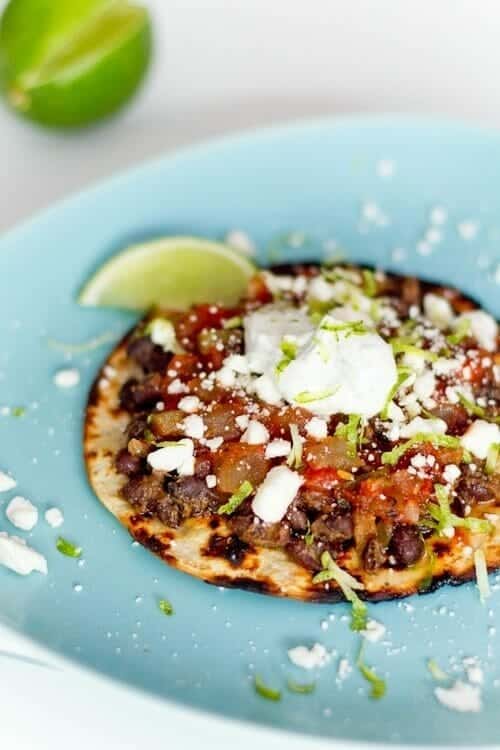 This black bean tostada recipe is quick and tasty, featuring a grilled tortilla (instead of the traditional fried one). Top with black beans, roasted tomato salsa, and queso fresco crumbles: and slather it all in a zingy sour cream dressing made with cumin and lime zest.