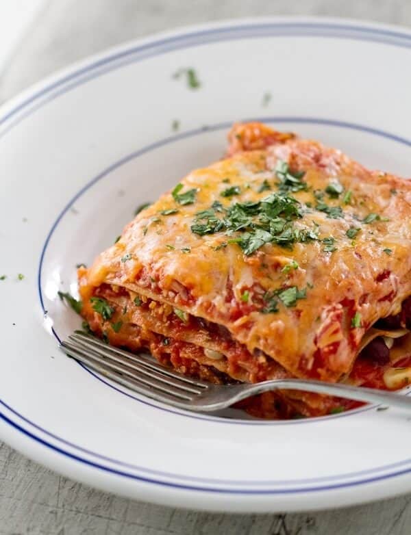 Last up in our black bean recipes: Mexican lasagna! It's the perfect fusion when you're not sure whether you want Italian or Mexican food. The noodles are layered with black beans, corn, tomato sauce, and gooey cheese. Top with fresh cilantro and enjoy!
