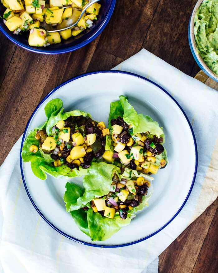 This black bean lettuce wraps recipe is outstanding. The combination of guacamole, spicy chipotle black beans, and mango salsa is an explosion of flavor and textures. For a vegetarian lettuce wrap, they’re surprisingly filling. And you can’t beat the health factor: they’re chock full of vegetables and accommodating for many diets.