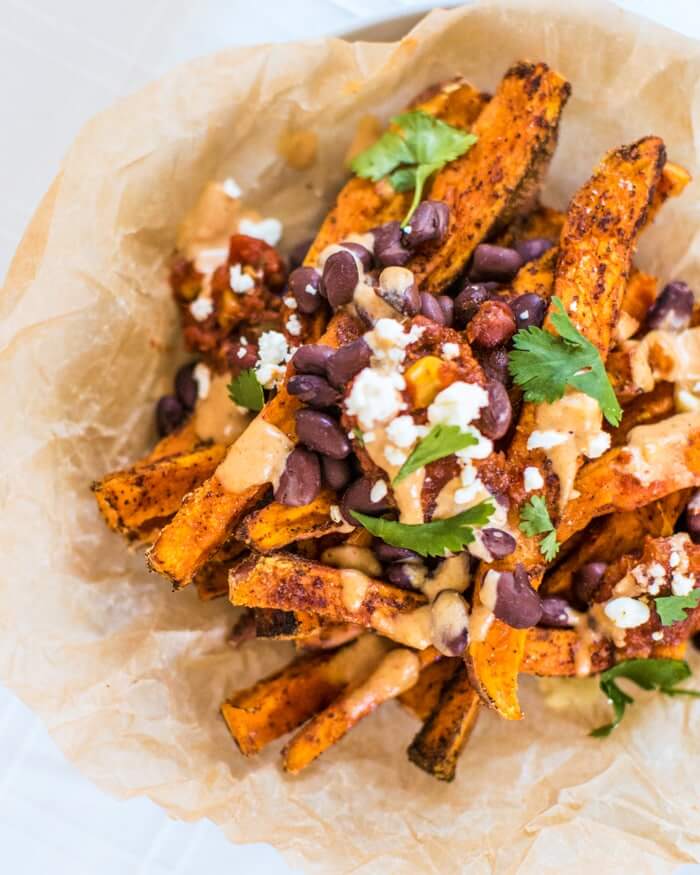 These tasty Mexican fries are wedges of sweet potato wedges loaded with black beans, salsa, and a vegan cumin lime crema made with tahini. The sweet potatoes and savory black beans compliment each other perfectly! Top with salty feta crumbles, or keep it vegan and go with chopped cilantro and a squirt of lime. It works as a snack or an easy plant based dinner!