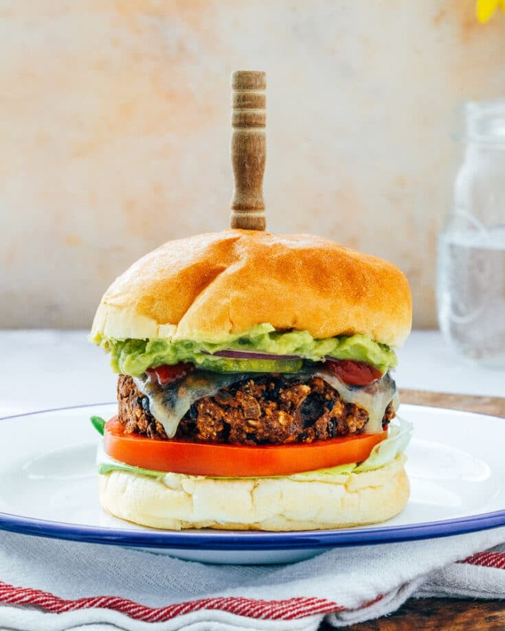 A good bean burger can be fantastic. This one is hearty and savory, spiced with cumin, garlic, and smoked paprika. Walnuts give it texture so it’s not just mush on a bun. Top it with cheese, guacamole and all the burger fixin’s, and it’s darn satisfying!