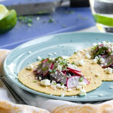 You can never have too many taco recipes, right? Over here, tacos are one of our favorite weeknight dinners because they’re so simple and versatile. We’ve made tacos with just about everything, from lentils to scrambled eggs. Today, we’ve got a phenomenal taco topper: radish salsa! It comes together in just minutes and adds big flavor to all your favorite taco recipes. Here it tops a quick black bean taco recipe that’s an incredibly tasty fast meal!