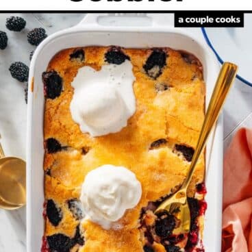 Traditionally a cobbler has a fruit filling topped with dollops of biscuit-like dough that’s lightly sweetened. But another popular way to make a cobbler in America is with a simple, cake-like topping that forms a solid sheet of batter, which is then scooped into bowls when serving. This blackberry cobbler recipe is a spin on the latter version, and similar to our blueberry cobbler, it makes for one easy and stunning dessert.