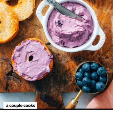 Blueberry cream cheese is one in a long list of homemade cream cheese flavors we love to make and serve as a brunch or bagel board! Here are a few more flavors we love: