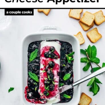 Appetizers should always be easy to whip up, we think! Because if you’re entertaining, there’s so much more to worry about (main dish, drinks, tableware, the list goes on). Here’s a trick that works for anytime and season: this Blueberry Goat Cheese appetizer! Imagine: a glossy, sweet tart blueberry sauce draped over a warm log of goat cheese, punctuated with pops of fresh herbs. Serve it on crackers or crostini, and no one will be able to stop dipping! You can make this with fresh or frozen berries, or as a shortcut use purchased blueberry jam. It’s always a hit in our family!