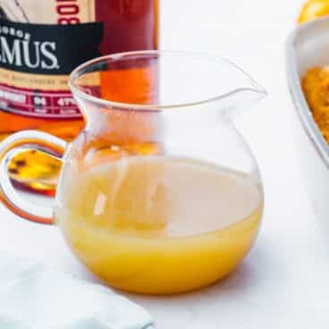- Once it turns golden brown at about 3 minutes, taste and make sure the flavor is caramelly with a hint of bourbon (the bite of the bourbon should be cooked out). Remove from the heat and strain it into a pitcher. Make ahead instructions: Make up to 2 days in advance, then refrigerate until serving. Rewarm on the stovetop over medium heat.
