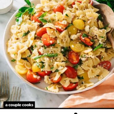 Pair the chewy noodles with tomatoes, fresh herbs, and feta cheese, then swirl it with a quick and easy vinaigrette dressing. It’s a quick side dish that everyone will love!