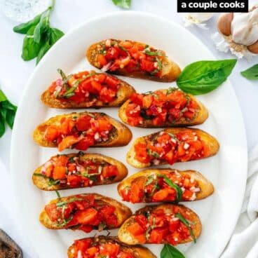 This bruschetta recipe pairs the traditional Italian grilled bread with tomatoes, garlic and basil. A simple, crowd-pleasing appetizer!
