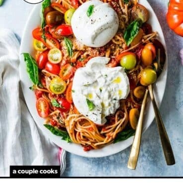 This burrata pasta recipe is all about presentation! It’s at its best when served on a large platter topped with all the fixings. Here are a few things to note: