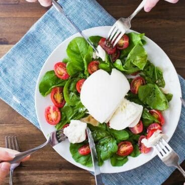 This burrata salad with tomatoes and arugula is all about the simplicity of fresh, incredible ingredients. After cutting into to the cheese, the cream floods the plate as a sort of dressing for the tomatoes and peppery arugula beneath it. This arugula and tomato burrata salad would go well as an appetizer with our other Italian-inspired recipes, or any summer meal. Here’s how to make it: