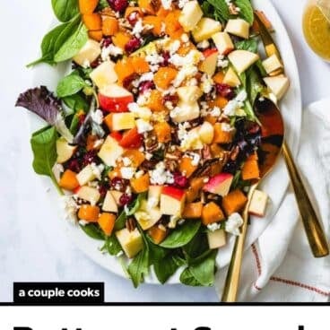 This butternut squash salad is bursting with flavor! Roasted squash combines with crisp apples, chewy cranberries, and crunchy pecans for a delightful textural contrast. A citrusy orange vinaigrette adds a bright and refreshing finish. Perfect as a fall or winter side dish!