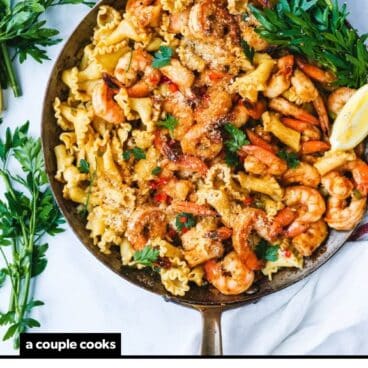 *To increase this recipe for more servings, we’d recommend making 1 pound pasta, but go up to 2 pounds on the shrimp (not 3). You can double the veggies and sauce ingredients accordingly.