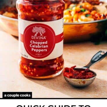 **Chopped or crushed Calabrian peppers are available in many grocery stores near the olives and pickles, or you can find them online. We used these chopped Calabrian peppers. The flavor is fruity and subtly spicy, and it’s absolutely worth finding! If not, use red pepper flakes. 1 teaspoon Calabrian chilis makes a medium spicy dish. Customize the heat level to your tastes!